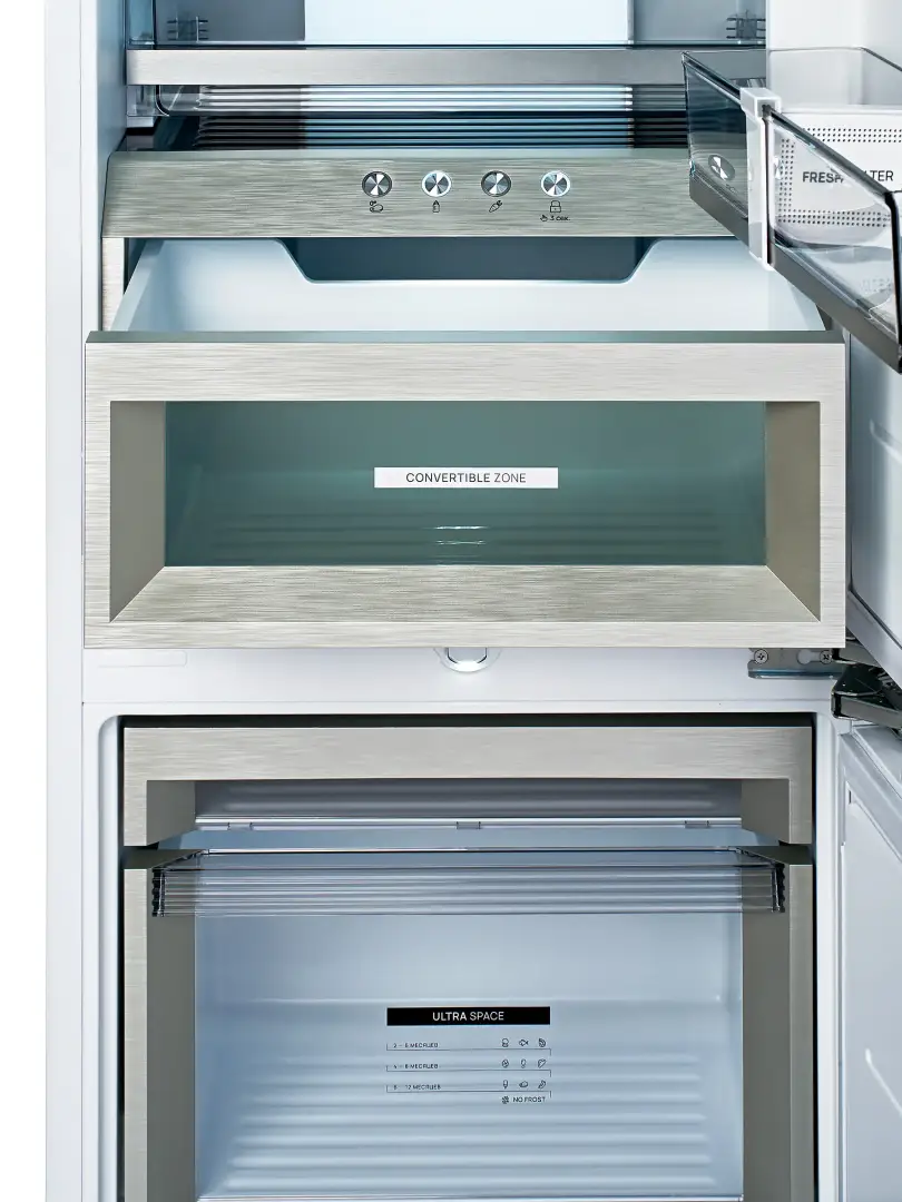 Convertible Zone представляет собой расположенное в нижней части холодильника отделение. Оно может использоваться для продуктов, требующих особых условий хранения, например мясных изделий, морепродуктов, при более низких температурах. В зависимости от того, что именно будет храниться в зоне свежести, вы можете установить нужную температуру в диапазоне от 0 до +4 °C, воспользовавшись сенсорной панелью управления.