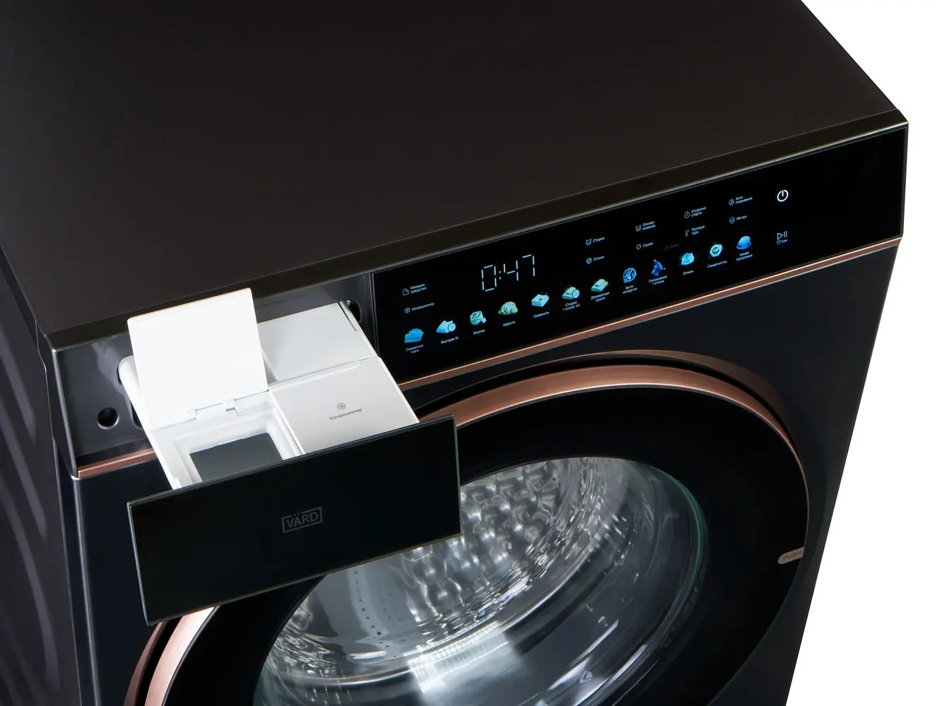 Стирально-сушильная машина серого цвета выделяется стильным дизайном, технологичностью и функциональностью