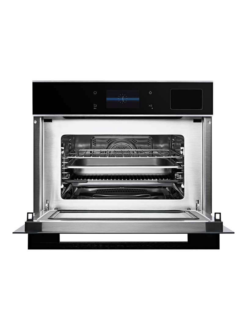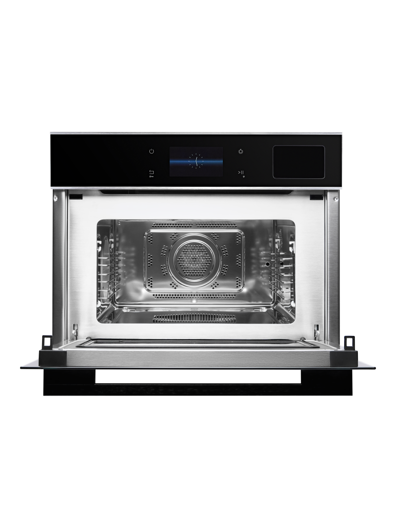 Компактное устройство 3 в 1 объединяет функции духового шкафа, микроволновой печи и пароварки, что позволяет экономить пространство на кухне и упростить процесс приготовления блюд за счёт комбинированных режимов.