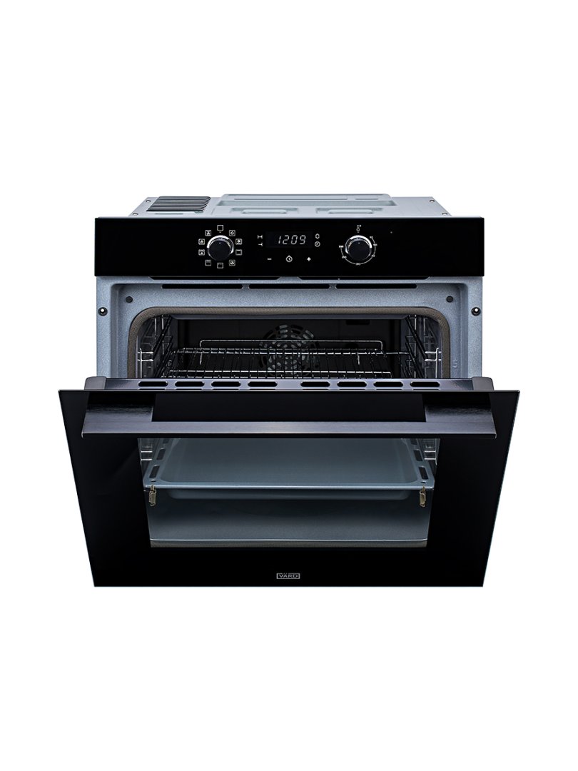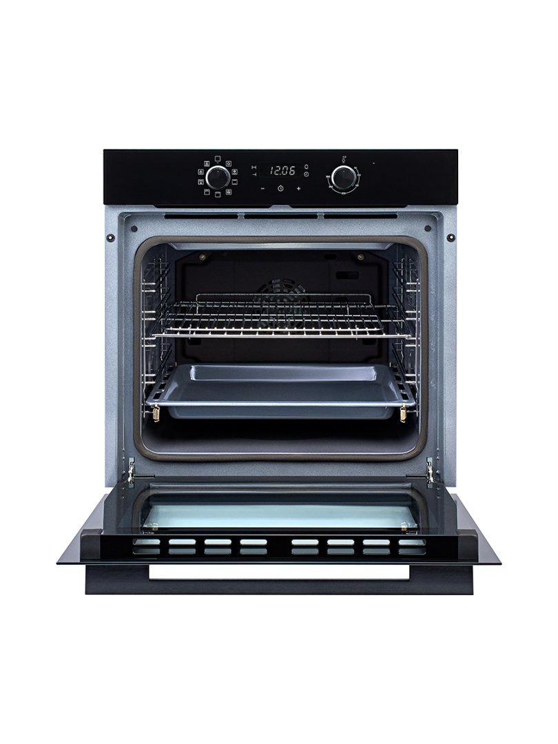 Черный встраиваемый духовой шкаф для современной кухни. Каталитическая очистка избавит от утомительного ухода за прибором, телескопические направляющие обеспечат удобство взаимодействия с блюдом, а нагрев 290 градусов позволит готовить пиццу как в печи