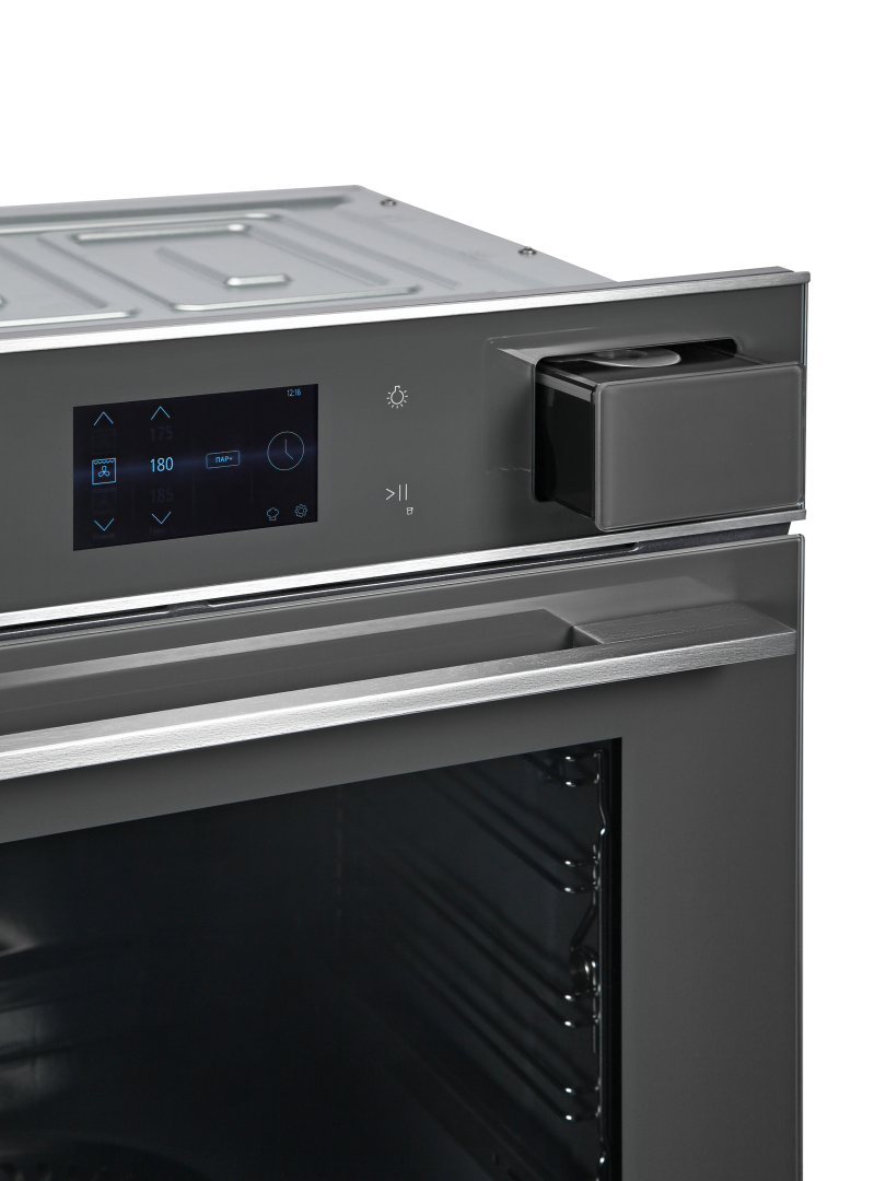 Сенсорный дисплей с русифицированным меню в духовом шкафу предназначен для удобного управления режимами приготовления, быстрого выбора температуры и времени, а также для автоматических рецептов, что делает процесс готовки более интуитивным и комфортным.